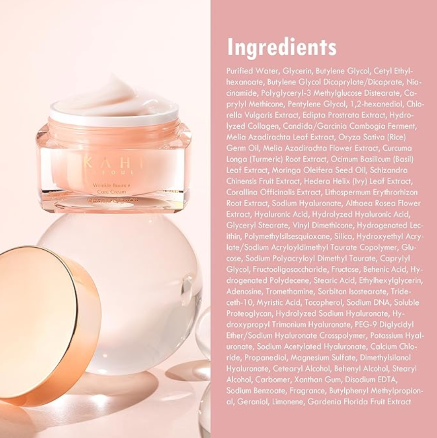 Purified Water, Glycerin, Butylene Glycol, Cetyl Ethylhexanoate, Butylene Glycol Dicaprylate/Dicaprate, Niacinamide, Polyglyceryl-3 Methylglucose Distearate, Caprylic/Capric Triglyceride, Pentylene Glycol, 12-Hexanediol, Chlorella Vulgaris Extract, Portulaca Oleracea Extract, Hydrolyzed Collagen, Candida/Garcinia Ferment Filtrate, Indian Moringa Leaf Extract, Rice Bran Oil, Indian Moringa Flower Extract, Curcuma Longa (Turmeric) Root Extract, Holy Basil Leaf Extract, Drumstick Seed Oil, Schisandra Extract, Western Pine Extract, Centella Asiatica Extract, Sodium Hyaluronate, Platelet Extract, Hyaluronic Acid, Hydrolyzed Hyaluronic Acid, Glyceryl Stearate, Vinyl Dimethicone, Hydrogenated Lecithin, Polymethylsilsesquioxane, Silica, Hydroxyethyl Acrylate/Sodium Acryloyldimethyl Taurate Copolymer, Glucose, Sodium Polyacrylate, Caprylyl Glycol, Fructooligosaccharides, Propanediol, Behenic Acid, Ethylhexylglycerin, Adenosine, Tromethamine, Sorbitan Isostearate, Myristic Acid, Triethoxycaprylylsilane, Copper Tripeptide-1, Tocopherol, Sodium DMEA, Soluble Proteoglycan, Hydrolyzed Sodium Hyaluronate, Hydroxypropyltrimonium Hyaluronate, PEG-9 Diglycidyl Ether/Sodium Hyaluronate Crosspolymer, Potassium Hyaluronate, Sodium Acetylated Hyaluronate, Calendula Officinalis Flower Extract, Propanediol, Magnesium Sulfate, Dimethylsilanol Hyaluronate, Cetearyl Alcohol, Behenyl Alcohol, Stearyl Alcohol, Carbomer, Xanthan Gum, Disodium EDTA, Fragrance, Butylphenyl Methylpropional, Geraniol, Limonene, Gardenia Extract.