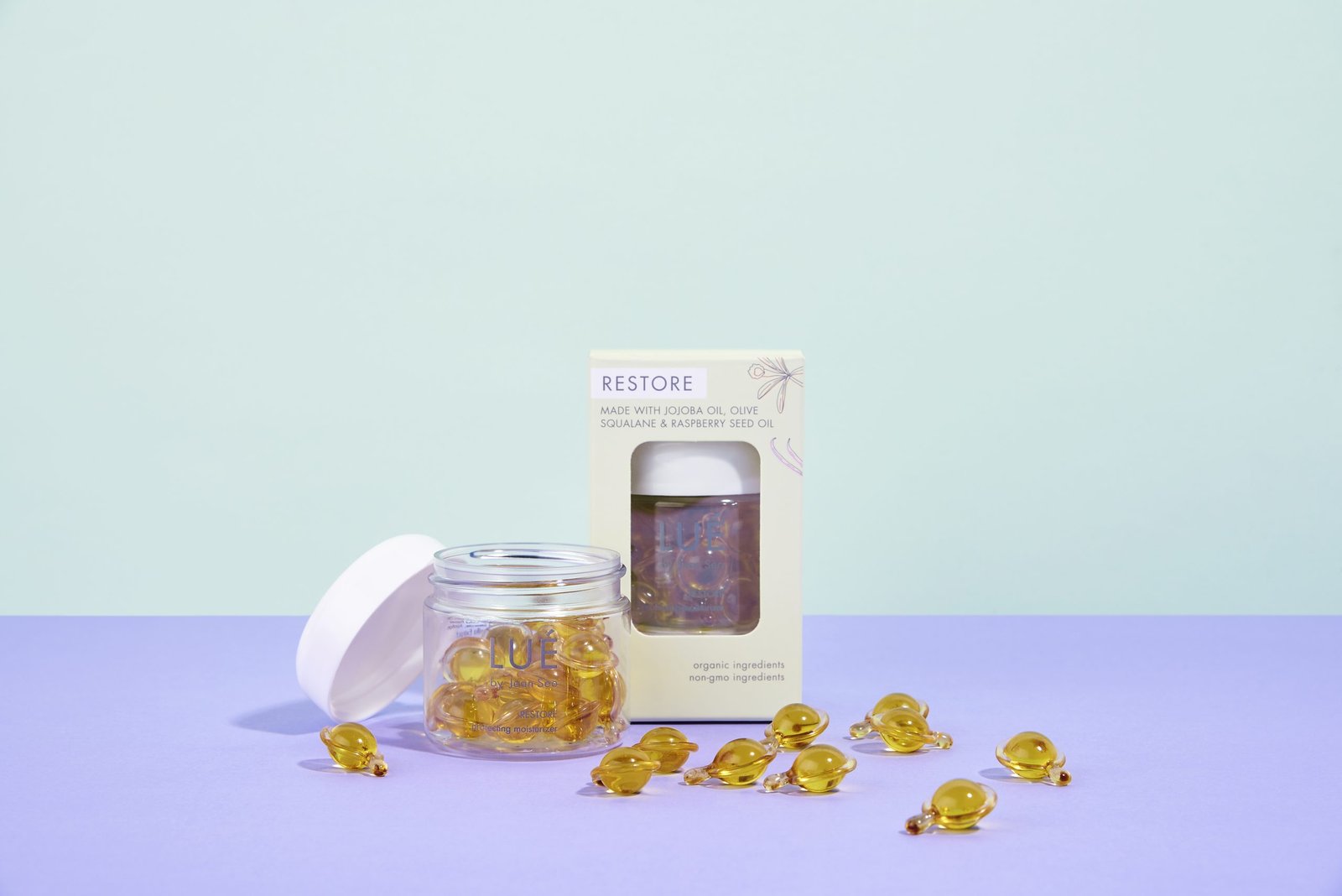 Packaged in 30 individual capsules, RESTORE to-go Nourishes and protects skin for a natural sheen with hydrating squalane oil, calming jojoba oil, and repairing raspberry seed oil.