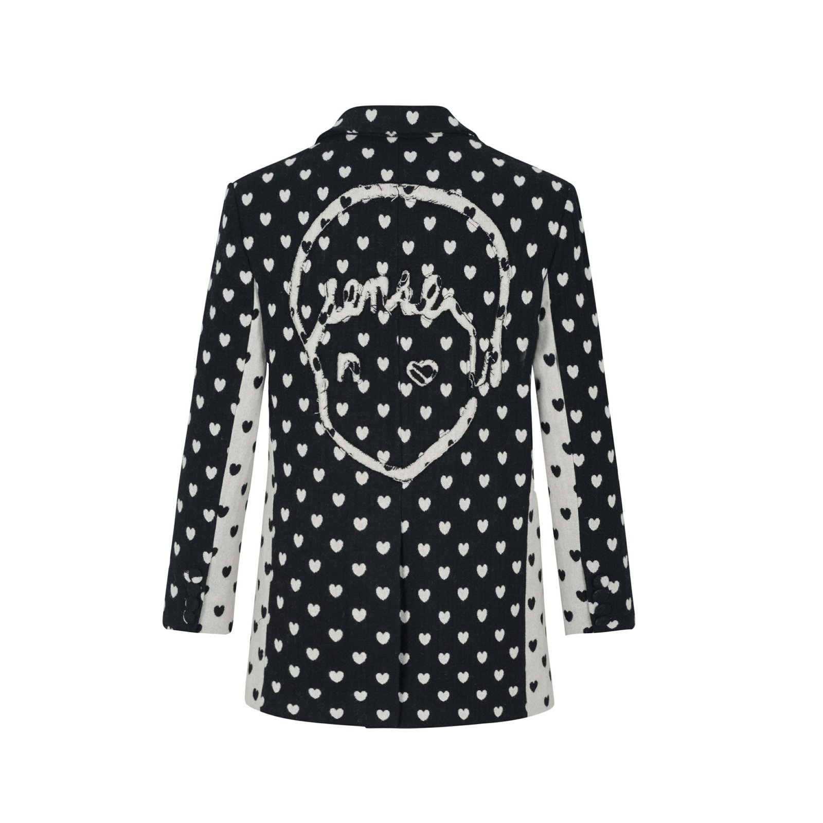 Black and white love splicing suit, wavy cutting line, back body with hollow baby headEmbrace a playful yet sophisticated look with our Black and White Heart Patchwork Suit. This suit features a unique design with heart-shaped patches in contrasting colors. The wave-cut lines add a touch of elegance, while the back of the suit showcases a charming hollowed-out boy’s head. Stand out with this eye-catching