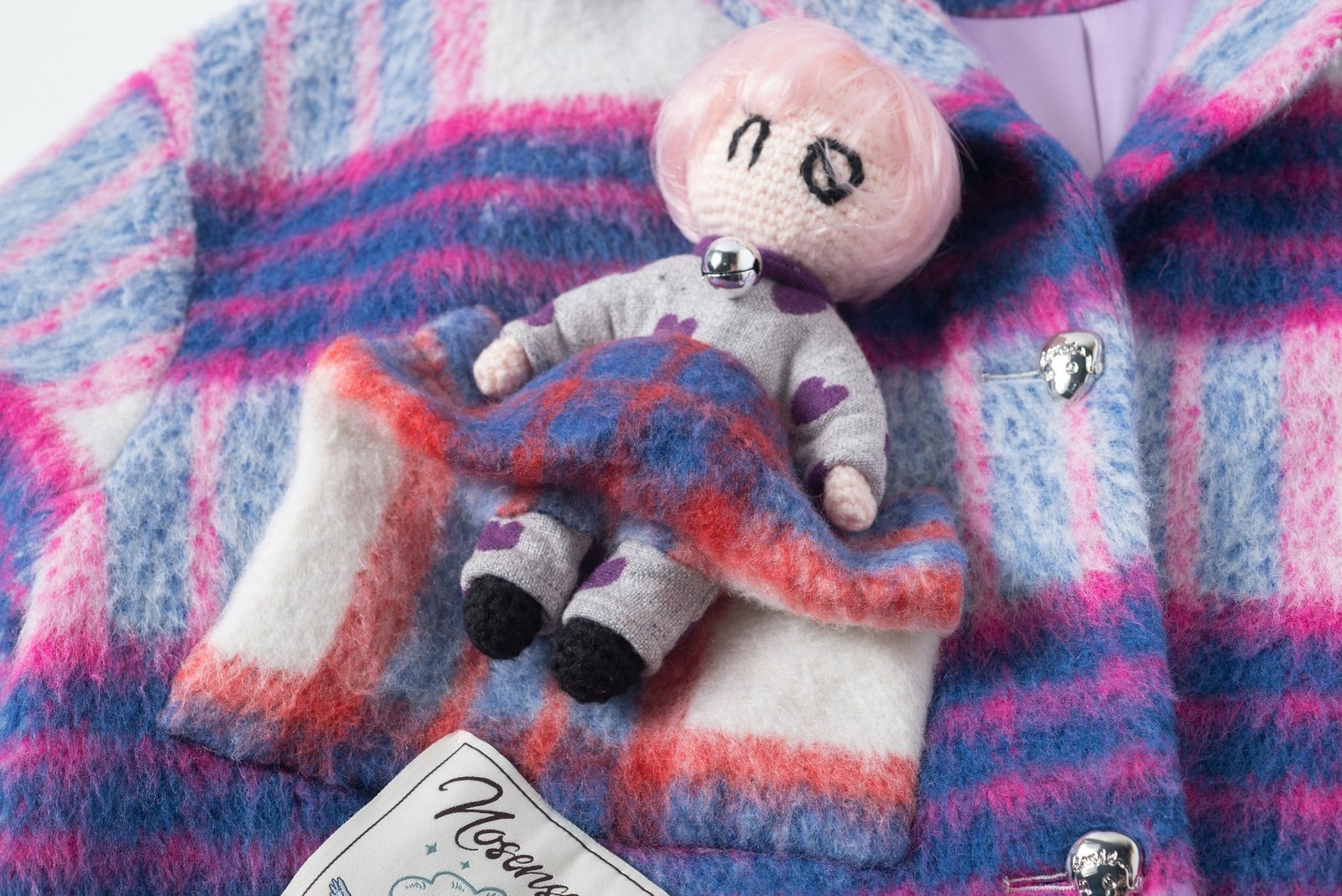 White and purple plaid jacket jacket, large pocket design with a boy doll on chest.
