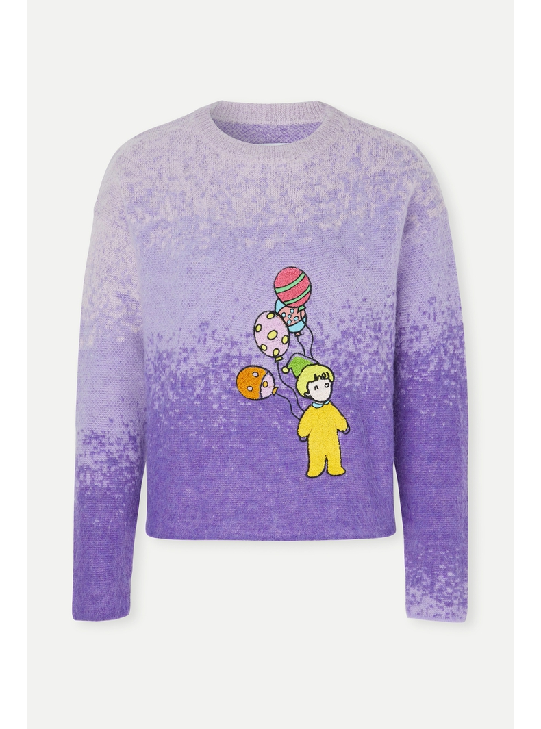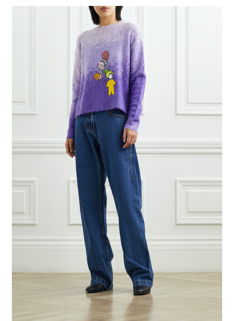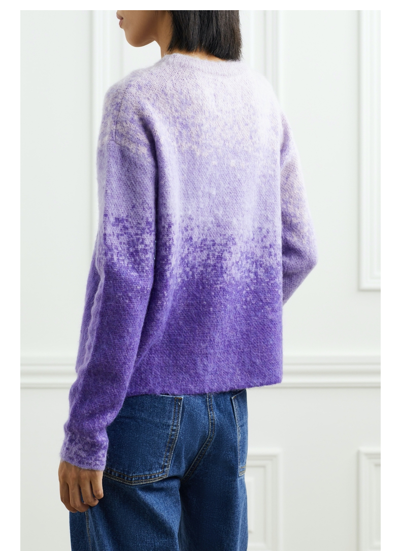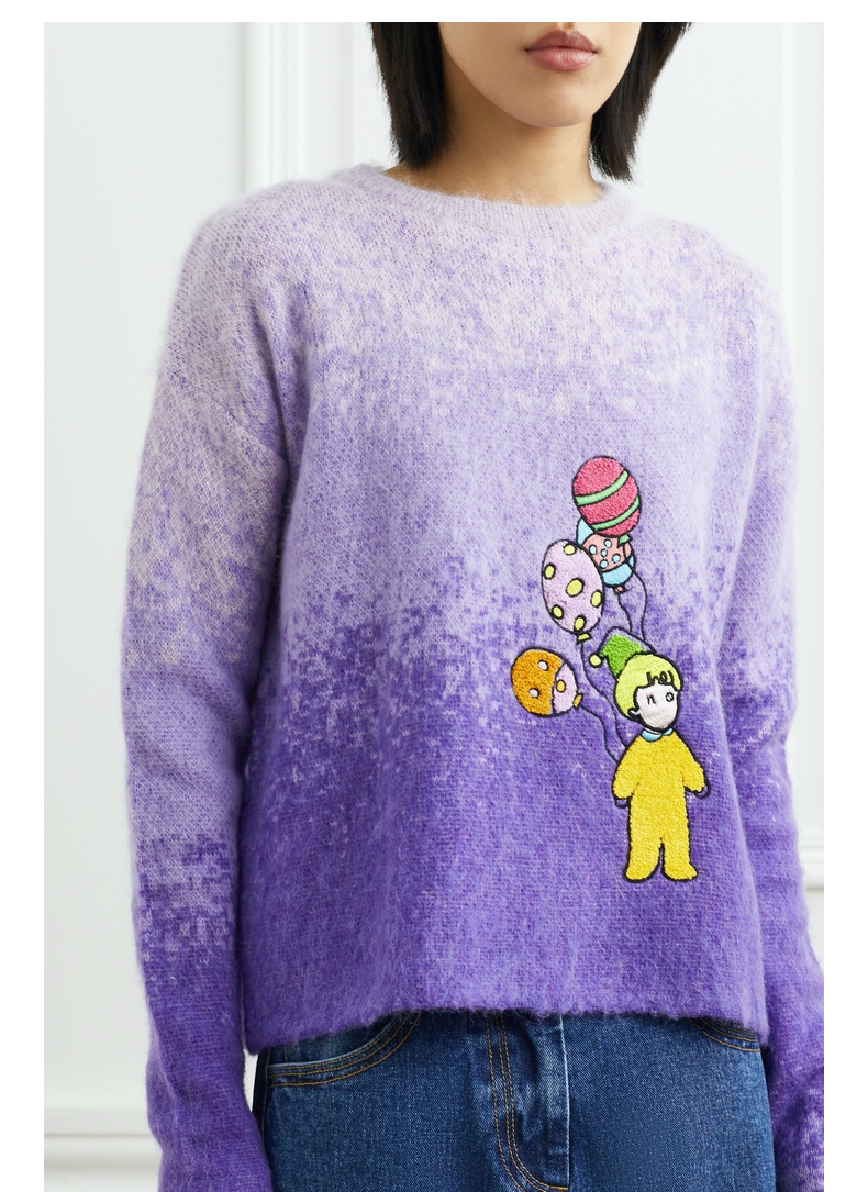 “NOSENSE OFFICIAL presents a sweater that exudes playfulness and charm, much like the brand’s other offerings. This garment is poised to become a coveted item for the autumn and winter seasons, offering enduring style and versatility. Skillfully crafted from a blend of mohair and wool, the sweater boasts a captivating purple ombre silhouette that imparts a refreshing aesthetic. Adorned with a whimsical embroidered pattern, reminiscent of childlike innocence, it showcases meticulous attention to detail. The design features a slightly loose fit, allowing it to be worn individually as a standalone piece or layered for added warmth and dimension.